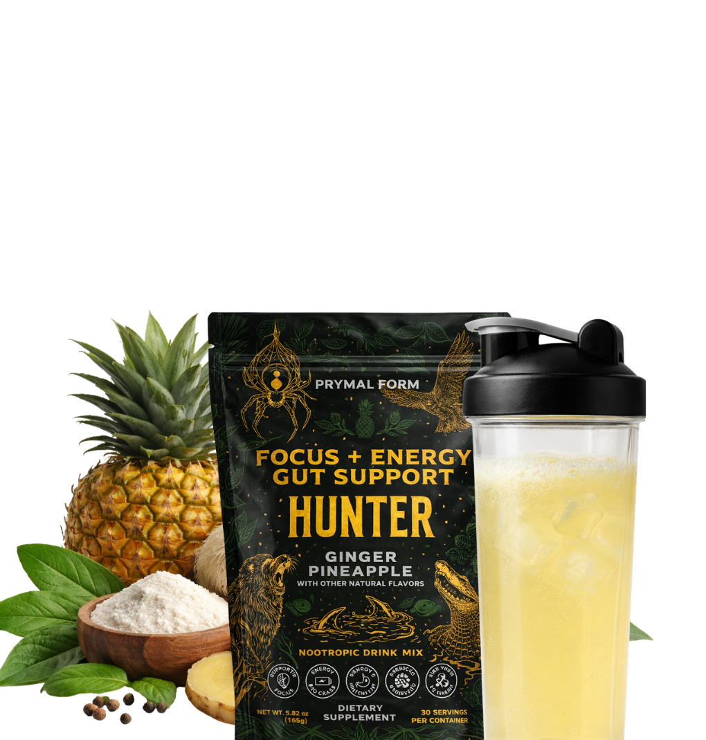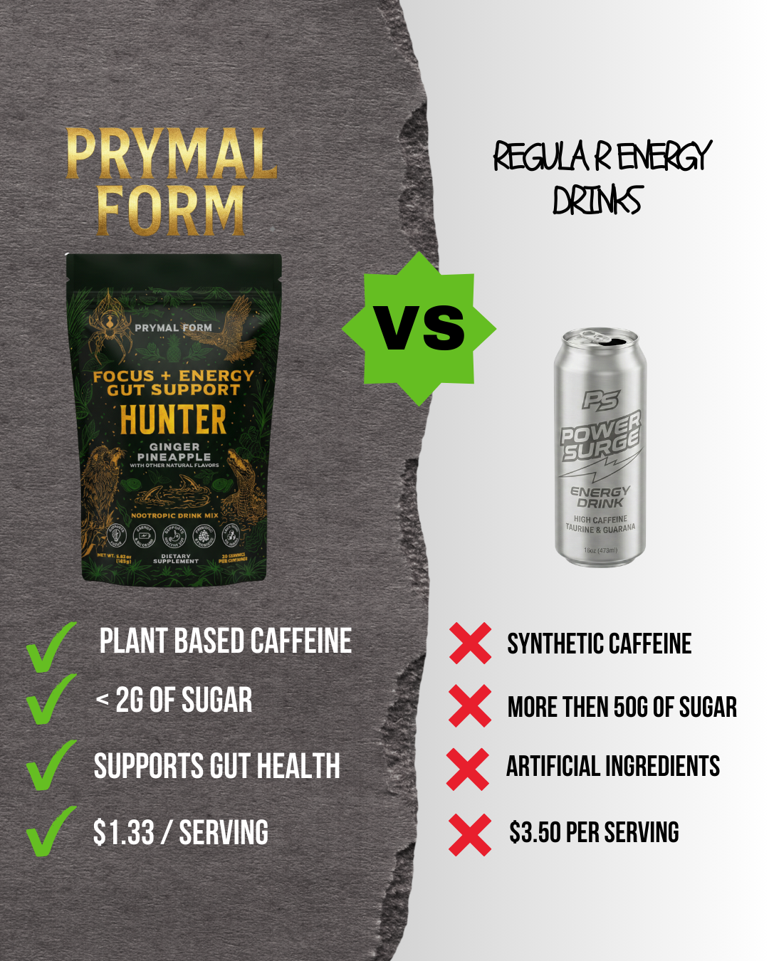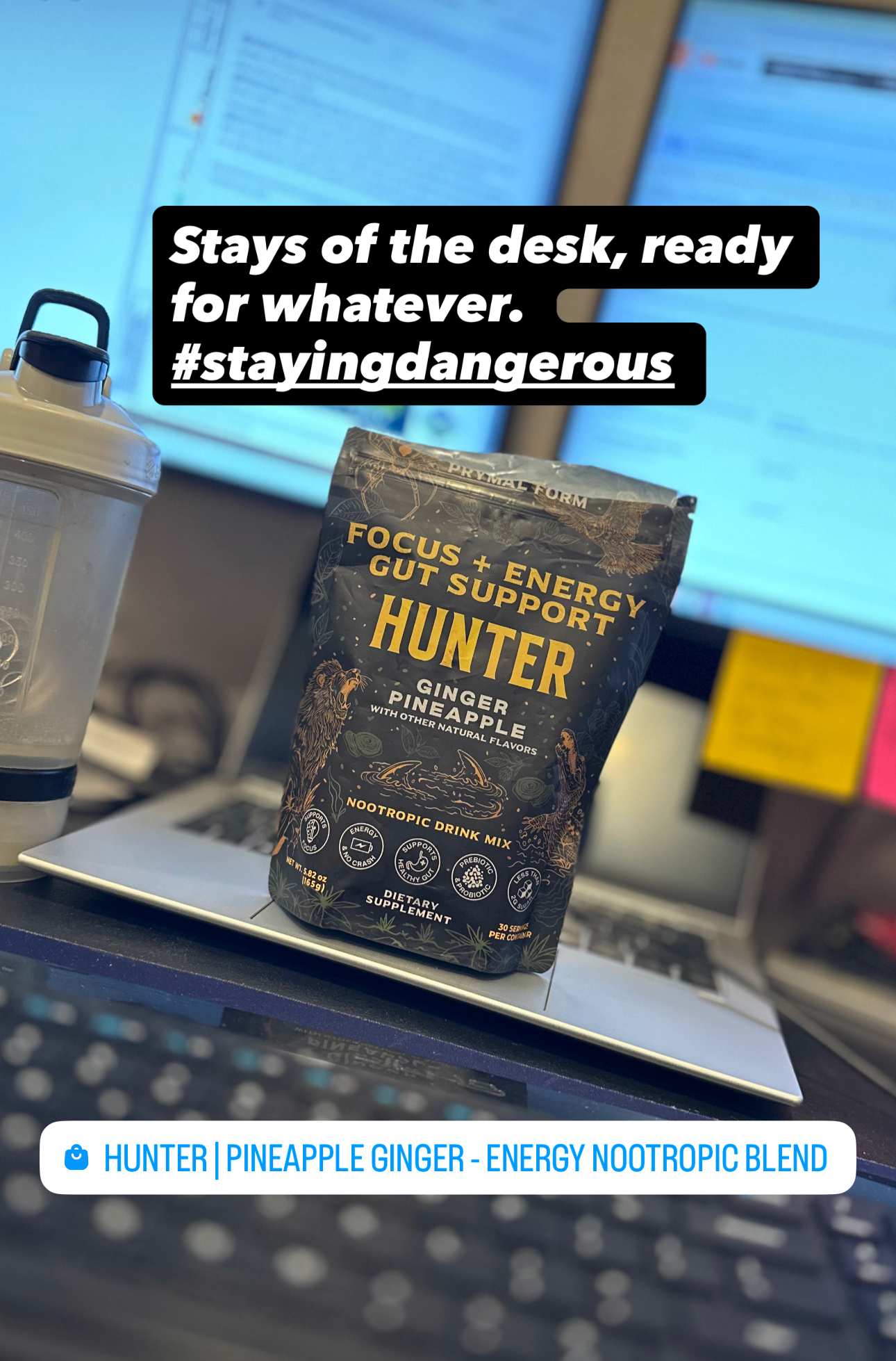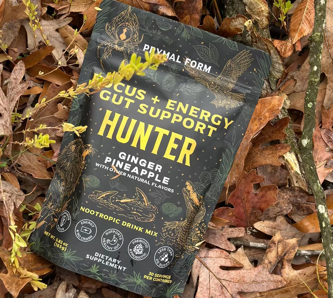 A little bit of both and more. Hunter is a plant-based focus and energy blend. It’s designed to support mental clarity, steady energy, and gut health but without the biblical sugar rush.